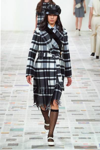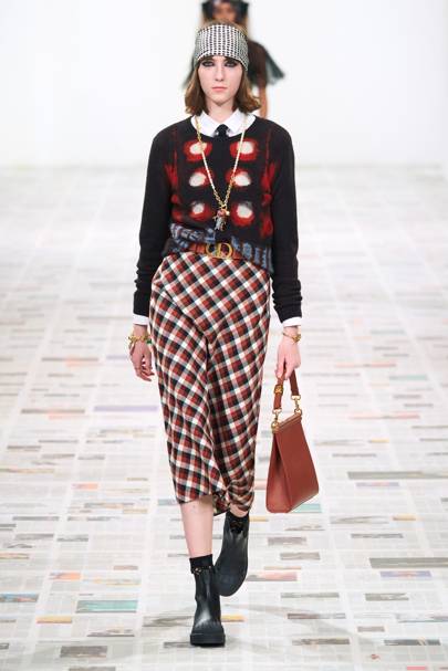 Effortless art prints, floaty silhouettes and a romantic colour palette, the collection embodied all the characteristics of a carefree spirit. As Kaia Gerber opened the show in a light, grid-checkered shirtdress, it was clear relaxed silhouettes were going to be a staple of the collection. And so they were as mid-calf and short dresses made their debut and so did skirts of varied lengths. The collection was also infused with 70s-style suits and attention to detail was present as there were illustrative badges on belts, embroidered collars and jewelled buttons and cuff-links on blouses.